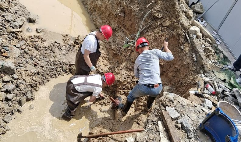 抢修人员通过对附近水管的压力检测,迅速定位到东方雨虹大厦工地施工导致水管挖破的问题,并准确找到了破损的DN200球墨管。