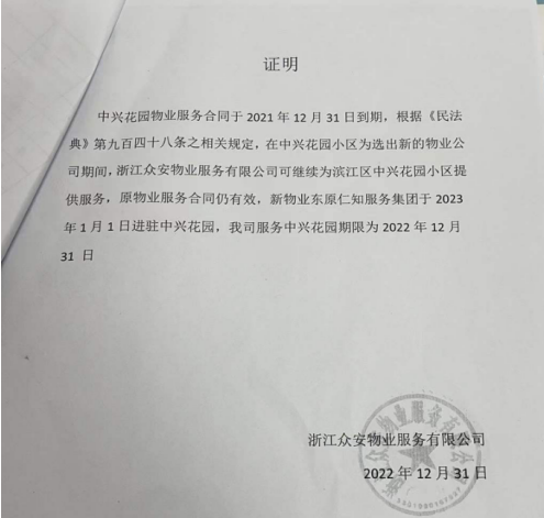 6月12日,浙江众安物业服务有限公司(中兴花园、百合苑东西两区原物业)向供水分公司三来部反映2022年12月31日已撤出两小区,不再管理其项目日常生活运转。但水表户号2000034320,2000034319仍在其托收账号下进行扣费,要求返还费用并取消托收业务。