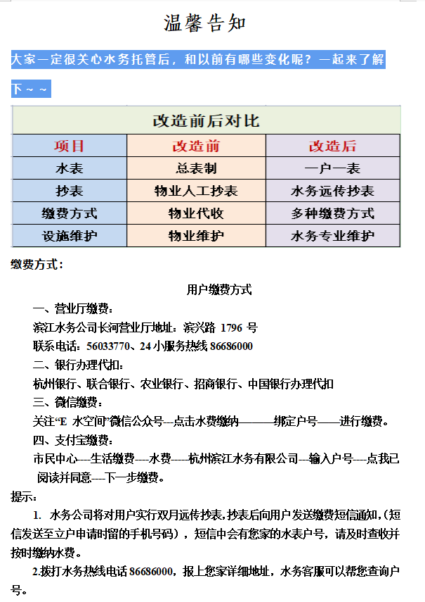 竣工结束后,不仅设备更新了,缴费方式也发生了变化。二供科又贴心的制作温馨表格,告知倾城之恋1800户业主生活用水将由原先的物业抄表、收费、服务转变为委托滨江水务公司专业化管理、抄表、收费、服务到每一户,并且改造后小区自来水管老化生锈爆管等问题都得到了解决,居民可以喝上稳定、洁净、放心的自来水。