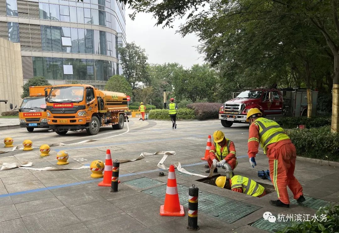 供水管网抢修应急演练模拟亚运保障酒店附近供水管道爆管,酒店加压泵房进水量减少,需要公司应急处理。接报后,公司立即启动应急预案,按照亚运会供排水应急抢修“13515”标准第一时间赶赴现场。供水抢修人员通过现场排查初步判断为DN500供水管爆管,立即根据预案对现场进行抢修,同时对保障酒店做好应急供水。